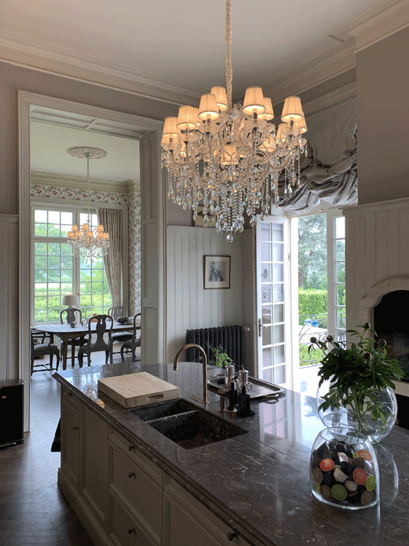 De eigenaren wilden graag historische elementen behouden, maar wel hun eigen twist eraan geven. Zo wordt de oorspronkelijke stijl en oudheid wel in ere gehouden. Zo hebben ze een bibliotheek in Engelse stijl gerenoveerd inclusief antieke ladders, waarbij men een beetje het ‘Harry Potter’ gevoel krijgt. Voor deze ruimte heeft de Haagsche Kunsthandel een zakkroon op maat gemaakt, waarbij de bovenkant extra lang is om een speels effect te creëren. Aan de onderkant hebben we extra LED-spots bevestigd zodat de eigenaren goed kunnen lezen onder de kroonluchter. Er zijn wel 10.000 steentjes van Swarovski-crystal verwerkt in deze lamp.