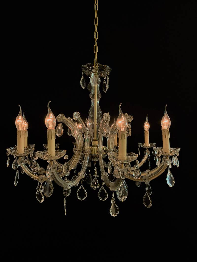 Vintage Kroonluchter uit de jaren '65, welke volledig is gerestaureerd. Hierbij is de kroonluchter helemaal uit elkaar geweest en zijn alle onderdelen schoongemaakt en waar nodig vervangen. Daarnaast is de gehele kroonluchter voorzien van nieuwe elektriciteit kabels. De kroonluchter is te herkennen aan zijn 10 lichts lampjes, waarbij de diameter 75 cm is en de hoogte van 75 cm (exclusief ketting). De kroonluchter is voorzien van kristal en de kleur van het frame is goud/messing. De kroonluchter hebben wij hangen in een van onze ruimtes en kan ter plekken gezien worden.